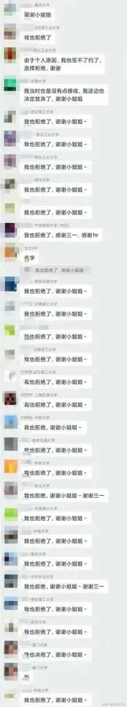 但万万没想到,在这位候选人在群内发消息拒绝offer后,竟然掀起了一波拒绝offer的跟风潮,一时间,群内满屏都是「我也拒绝了,谢谢小姐姐」,这对于HR而言,无疑是大写的人间惨剧。