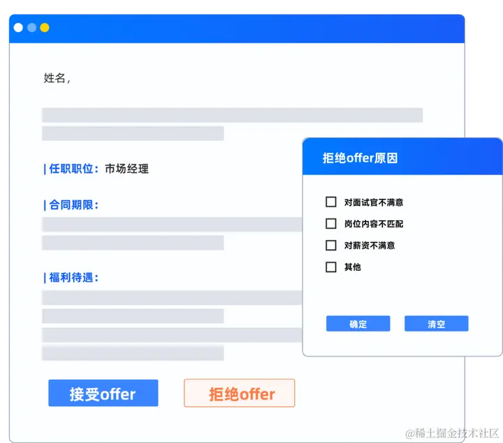 同时,在offer发放环节,大易云招聘平台也可以助企业一臂之力。首先,企业可以自定义offer模版,系统将根据模版批量生成offer进行发送,优化雇主品牌形象的同时也免去了HR大量的重复性工作;其次,候选人可通过点选接收或拒绝按钮,对offer进行极速反馈,接收offer的候选人可直达入职信息登记页面进行补充填写,拒绝offer的候选人还可填写拒绝原因,便于企业追踪复盘。