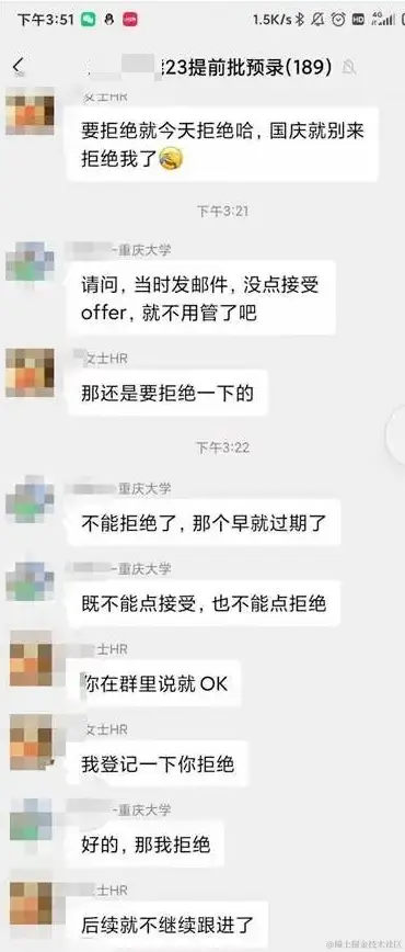 近日,一张截图在HR圈流传开来,图中显示,在一家企业的2023届候选人社群中,一位准员工在群内询问HR如何拒绝offer,HR表明需要在群内说一下,并表明「要拒绝就今天,国庆后就不要来拒绝了」。