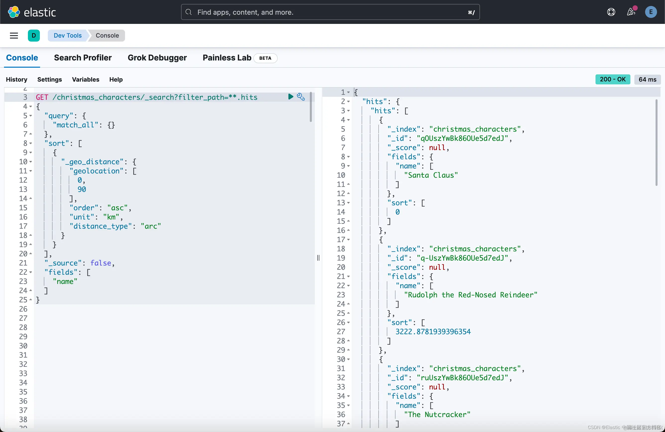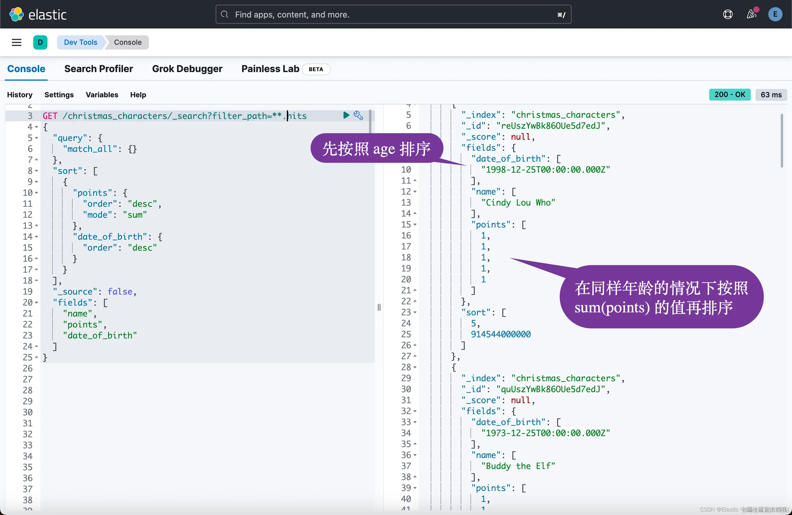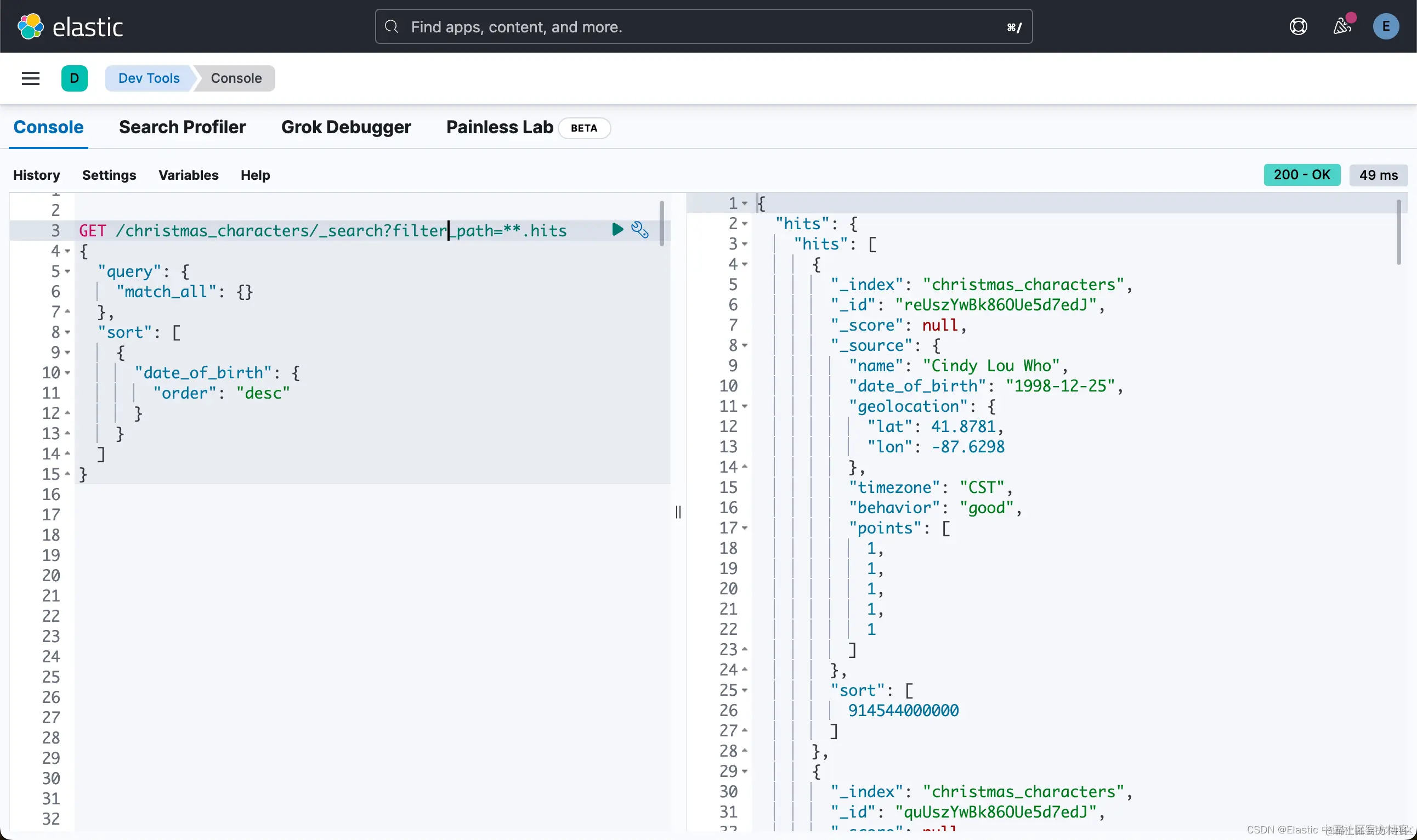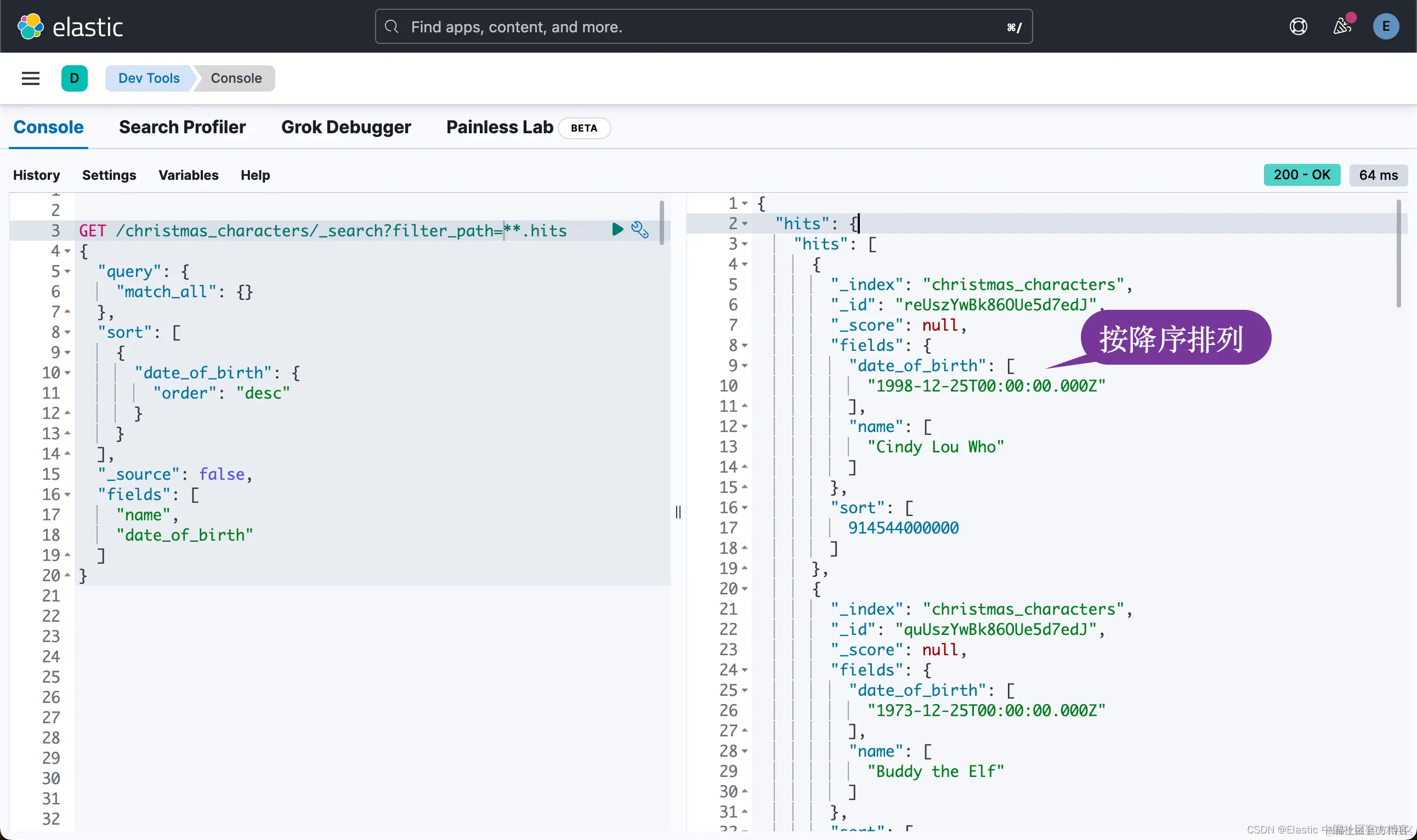 或许年纪越小,等待的耐心就越少。 或者你需要早点睡觉。 因此,让我们使用 match_all 来匹配所有文档,并按 date_of_birth 字段降序排序。