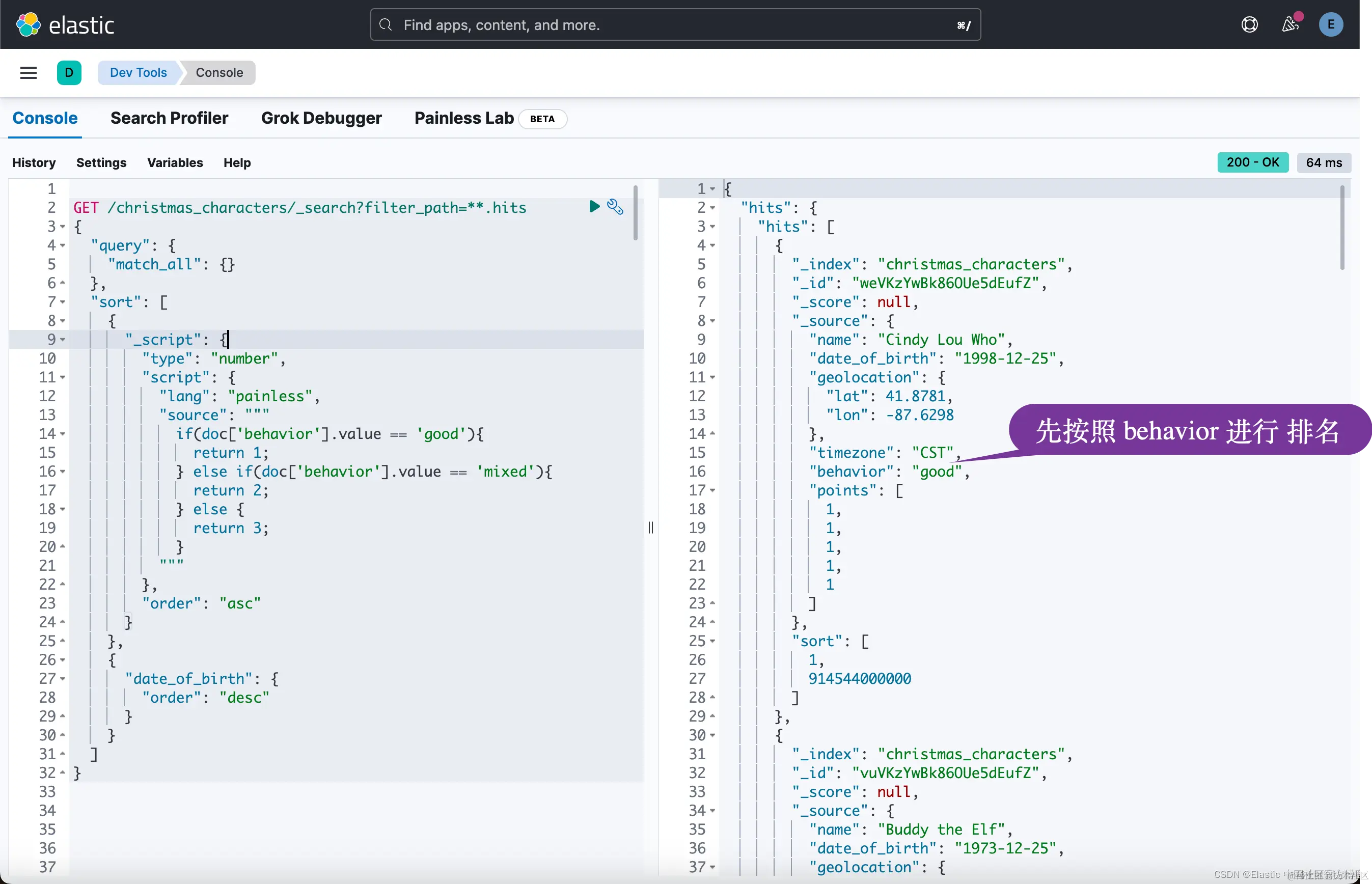 在上面,我们使用 Painless 脚本来计算一个 script field。它是一个 number 类型的数据。具体它的名字是什么,我们无需知道它的名字。我们可以在 sort 里对它进行排名。
