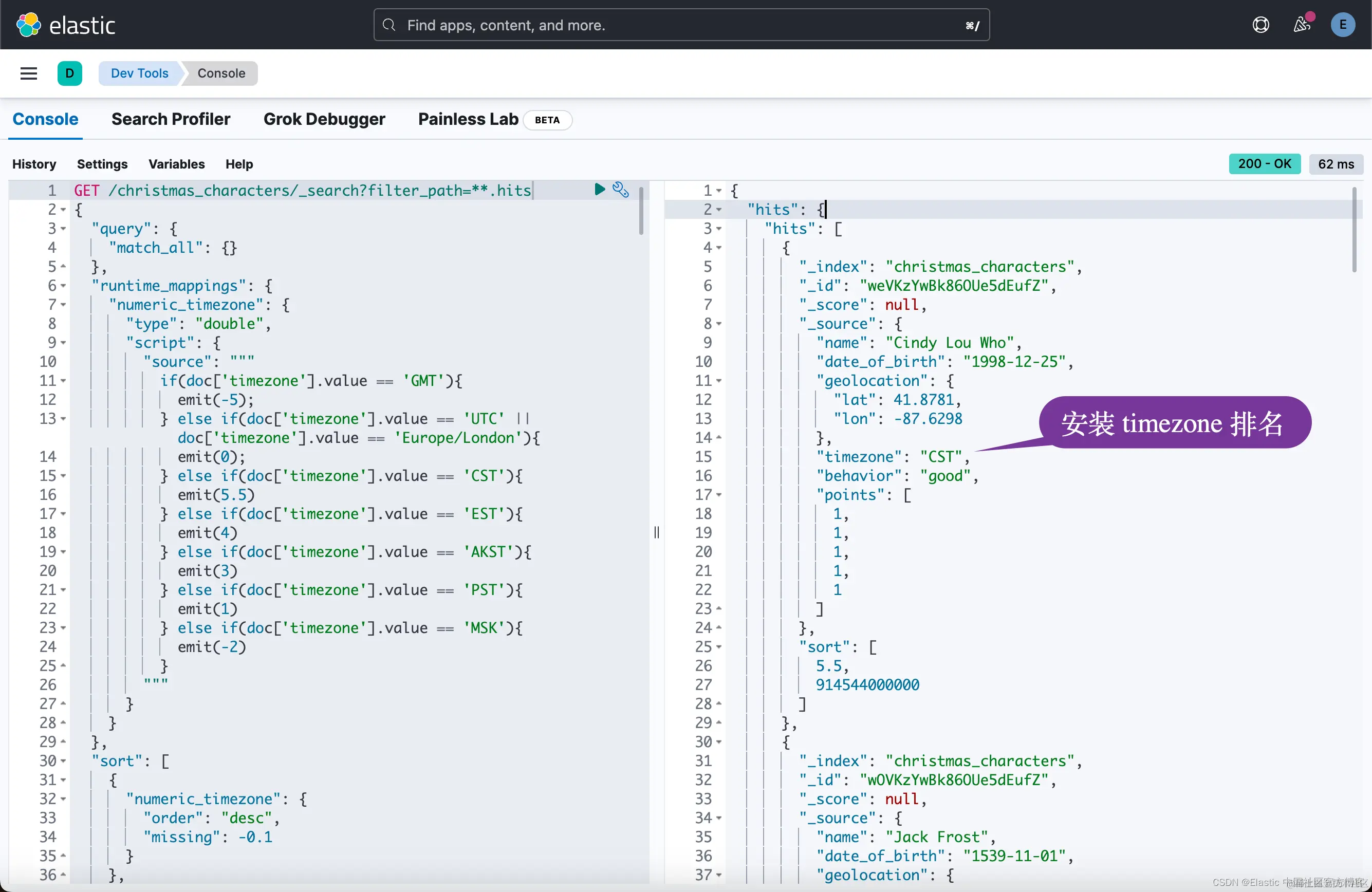 你可以再次使用 Painless 对(查询时)运行时字段执行与上一个示例相同的操作 - 尽管此示例按时区排序,以便每个人都可以在晚上进行访问。 此代码片段还引入了 missing 的概念,通常使用魔术值 _first 或 _last,但它也可以是静态值,如本例所示。