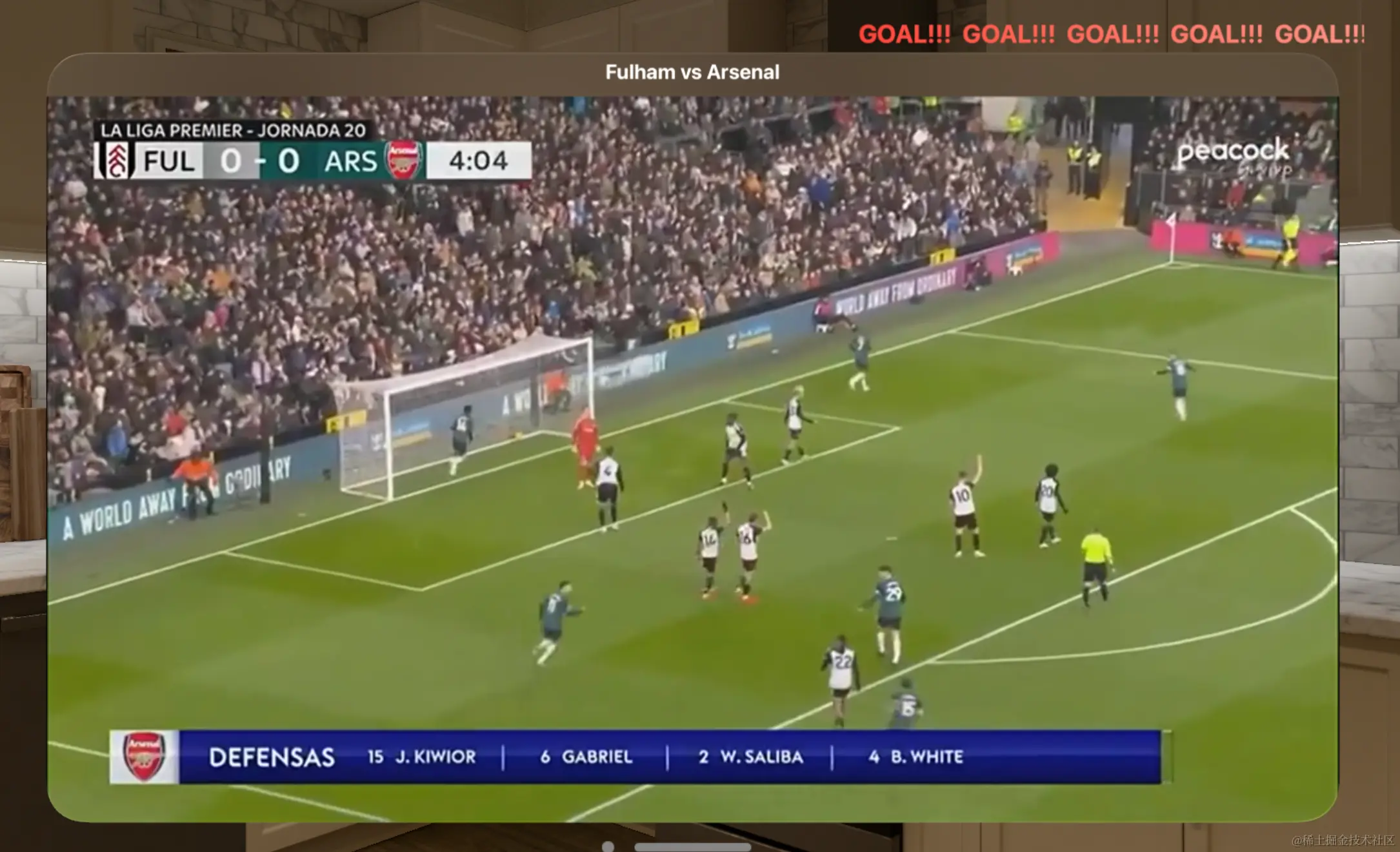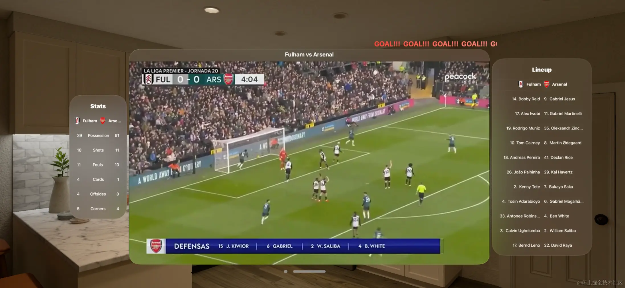 由于 visionOS 拥有无边画布,因此除了在进球时才展示的字幕外,我们还可以添加更多的窗口展示比赛相关的信息,同时不会影响视频的播放,如阵容、比赛数据等信息。