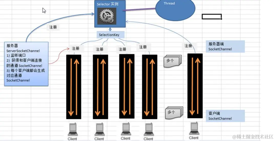1、Java 的 NIO,用非阻塞的 IO 方式。可以用一个线程,处理多个的客户端连接,就会使用到Selector(选择器)。