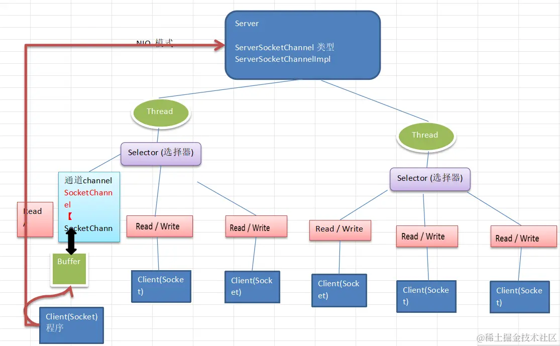 当客户端连接一个server的时候,由这个serversocketchannel 与这个客户端对应的socketchannel,然后与服务器之间进行通讯