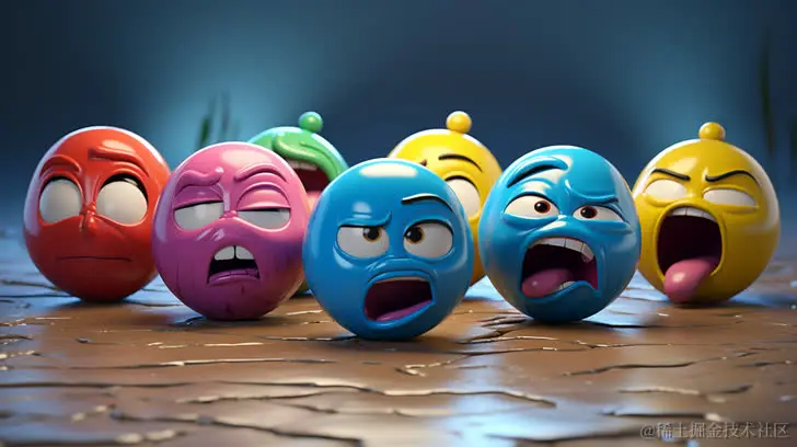 Vray追踪风格的动态表情符号,橙色和靛蓝,32k UHD,湿润,照片般逼真技术,Berrypunk,表情丰富