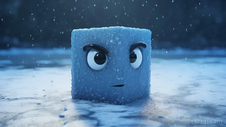 带水汪汪眼睛的哀伤蓝色方块,采用Cinema4D风格渲染,雪景,发光球体,卡通面孔,湿润,厚重质感,RTX