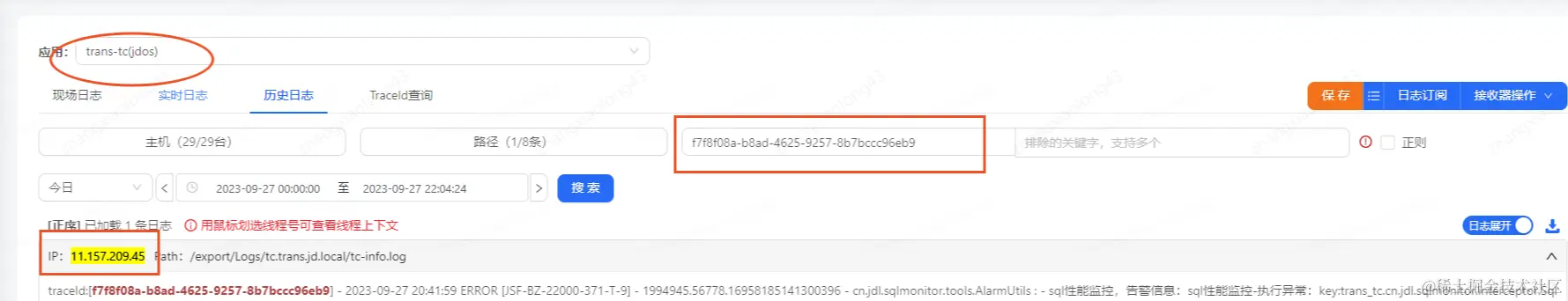 上述所述均为透传ID场景的原理和示例代码,实战效果如下图:调用jsf超时,跨系统查看日志进行排查,得知为慢sql引起