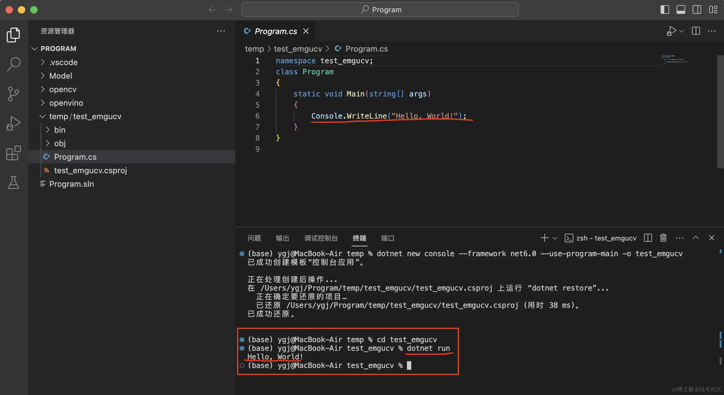 前言OpenCV是一个基于Apache2.0许可(开源)发行的跨平台计算机视觉和机器学习软件库,它具有C++,Python,Java和MATLAB接口,并支持Windows,Linux,Android和Mac OS。 Emgu CV是OpenCV图像处理库的跨平台 .Net 包装器。允许从 .NET 兼容语言调用OpenCV函数。但是网上目前关于在Mac OS上使用EmguCV的教程较少,而我后续推出的OpenVINO C# API项目将支持Mac OS系统,为了大家后续能够使用,特出一期教程来演示一下Mac OS上使用EmguCV。