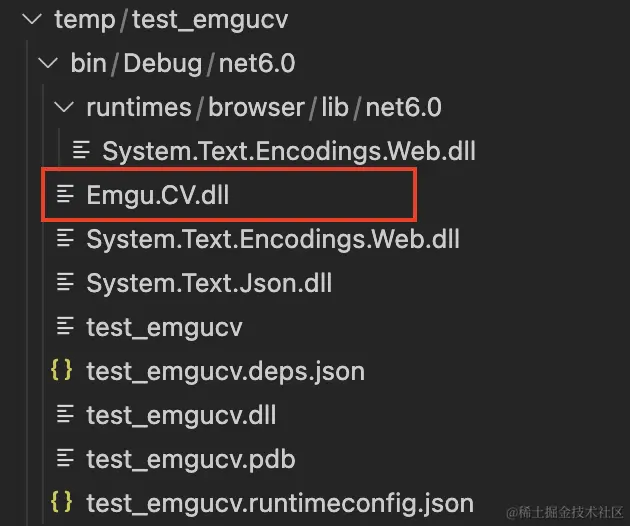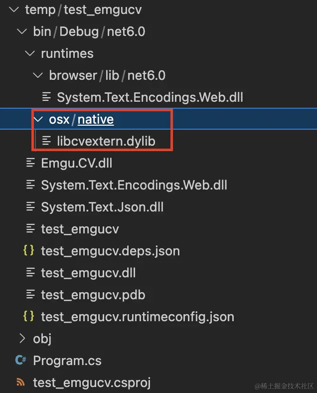 接下来运行dotnet run,检验项目中是否包含所需要的配置文件:Emgu.CV.dll、runtimes/osx/native/libcvextern.dylib。打开项目运行生成的文件夹bin/{build_config}/{dotnet_version}/,在本项目中是bin/Debug/net6.0/文件夹,如下图所示: