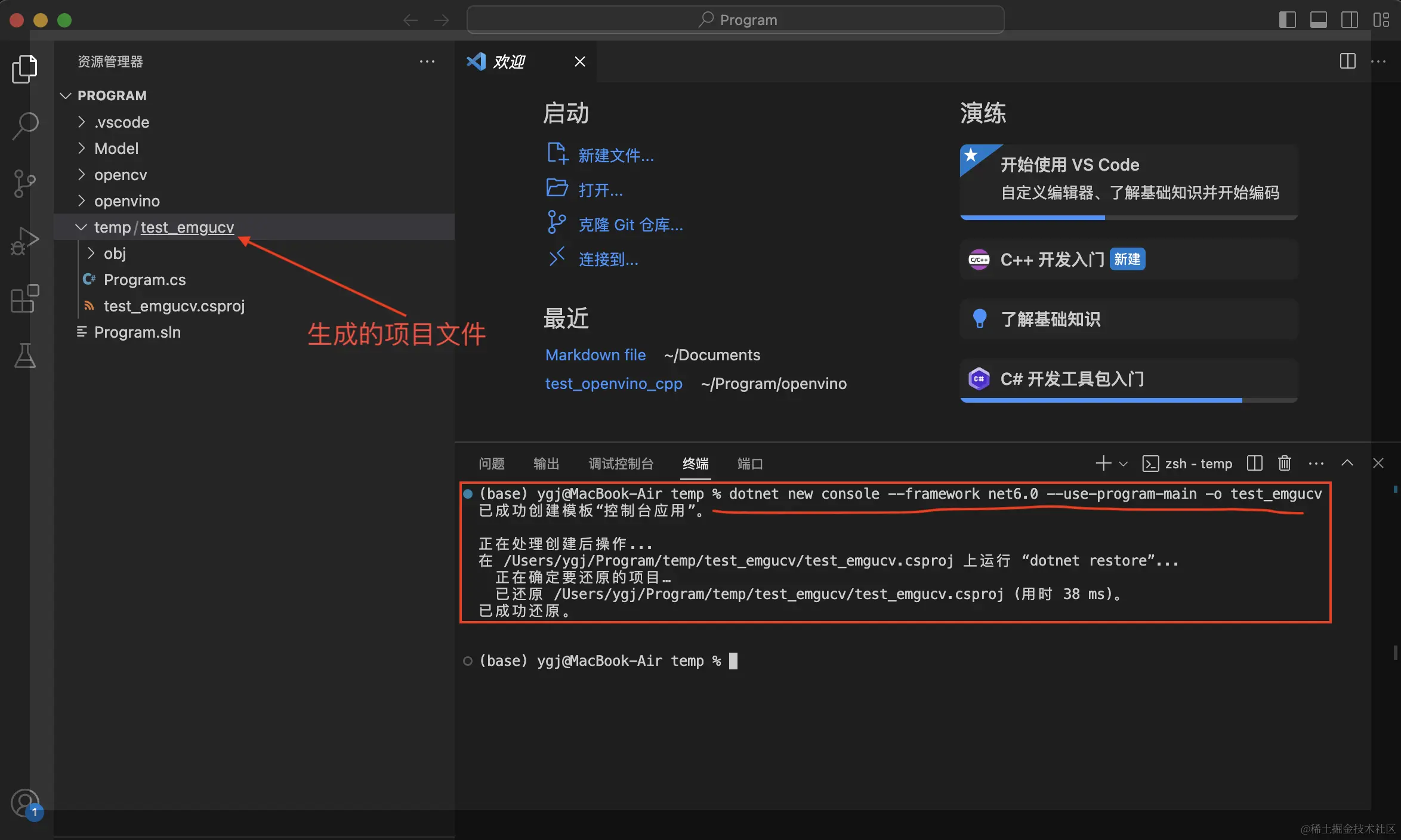 此处使用dotnet指令创建新项目,在Visual Studio Code的终端中输入一下指令: