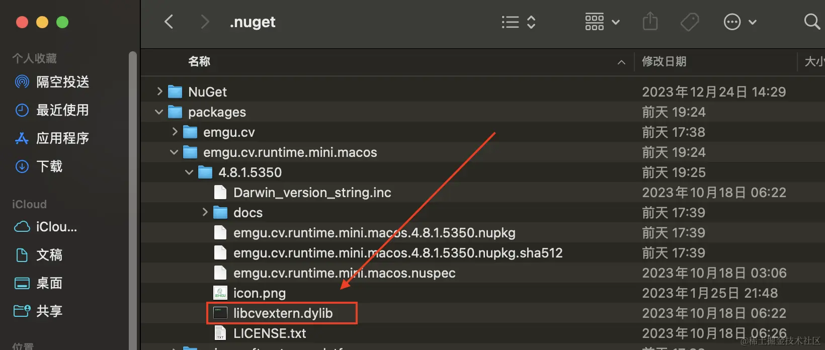 通过该图可以看出,在本项目中只有Emgu.CV.dll文件,并没有runtimes/osx/native/libcvextern.dylib文件,因该文件需要我们自行配置。首先是需要找到该文件,该文件主要是在Emgu.CV.runtime.mini.macos程序包中,如下图所示: