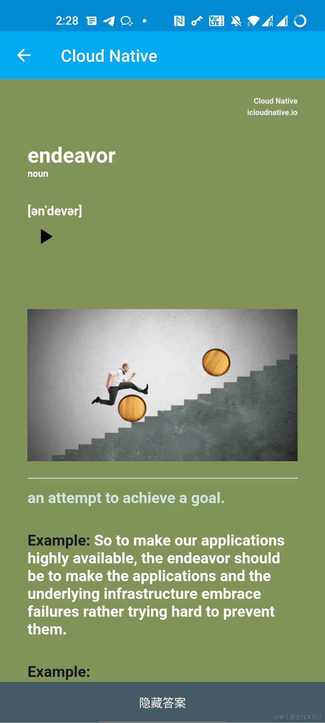 每张卡片只有一个英文单词,与之配套的是该单词的音标、发音、图片、英文解释、例句。所有的版块都是英文,绝对不要出现中文! 卡片的核心是图片和例句,通过图片可以猜到这个单词大概是什么意思,通过例句可以验证自己对单词意思的猜测是否正确,如果还不放心,可以看下英文解释,这一套流程下来绝对可以正确理解单词的意思,完全不需要中文的干涉,这才是学习英文单词最完美的方式。
