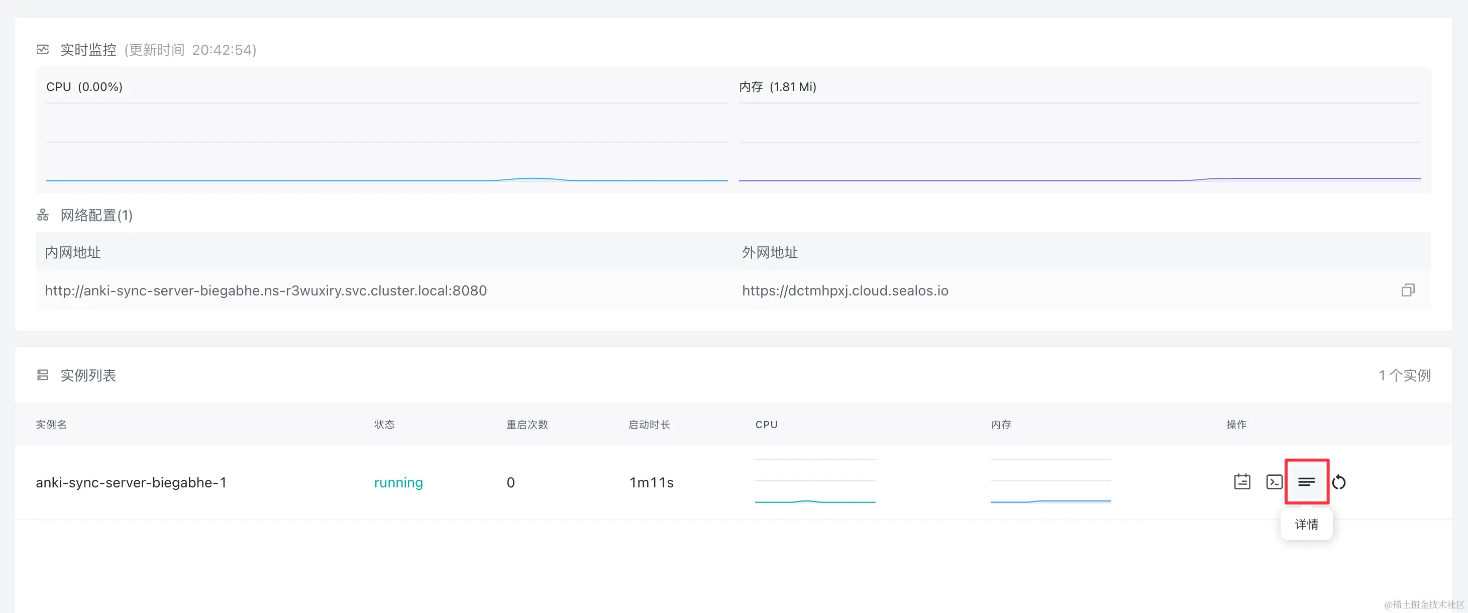 部署成功后,可以看到应用的运行情况,包括 CPU 占用、内存占用等。外网地址就是同步服务器的公网域名。