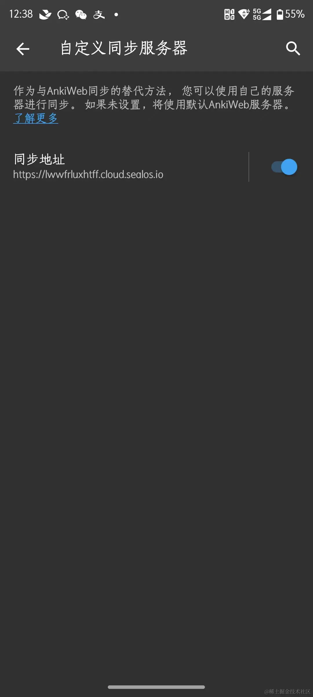 安卓端也是直接配置即可,我的 AnkiDroid 版本是 2.15.6。你可以通过「设置 -> 高级设置 -> 自定义同步服务器」找到配置页面。