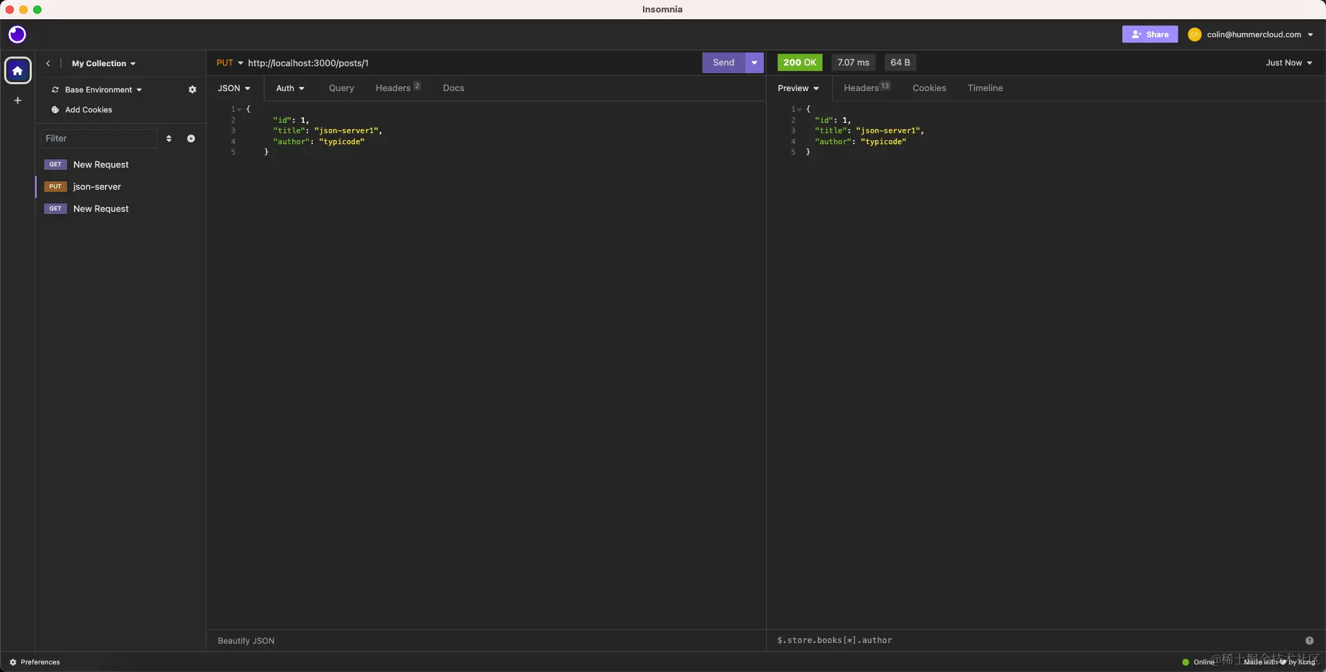 还可以像普通 Rest API 一样来使用的,比如PUT 修改数据,Delete删除等,都会对应的存到JSON文件中去。