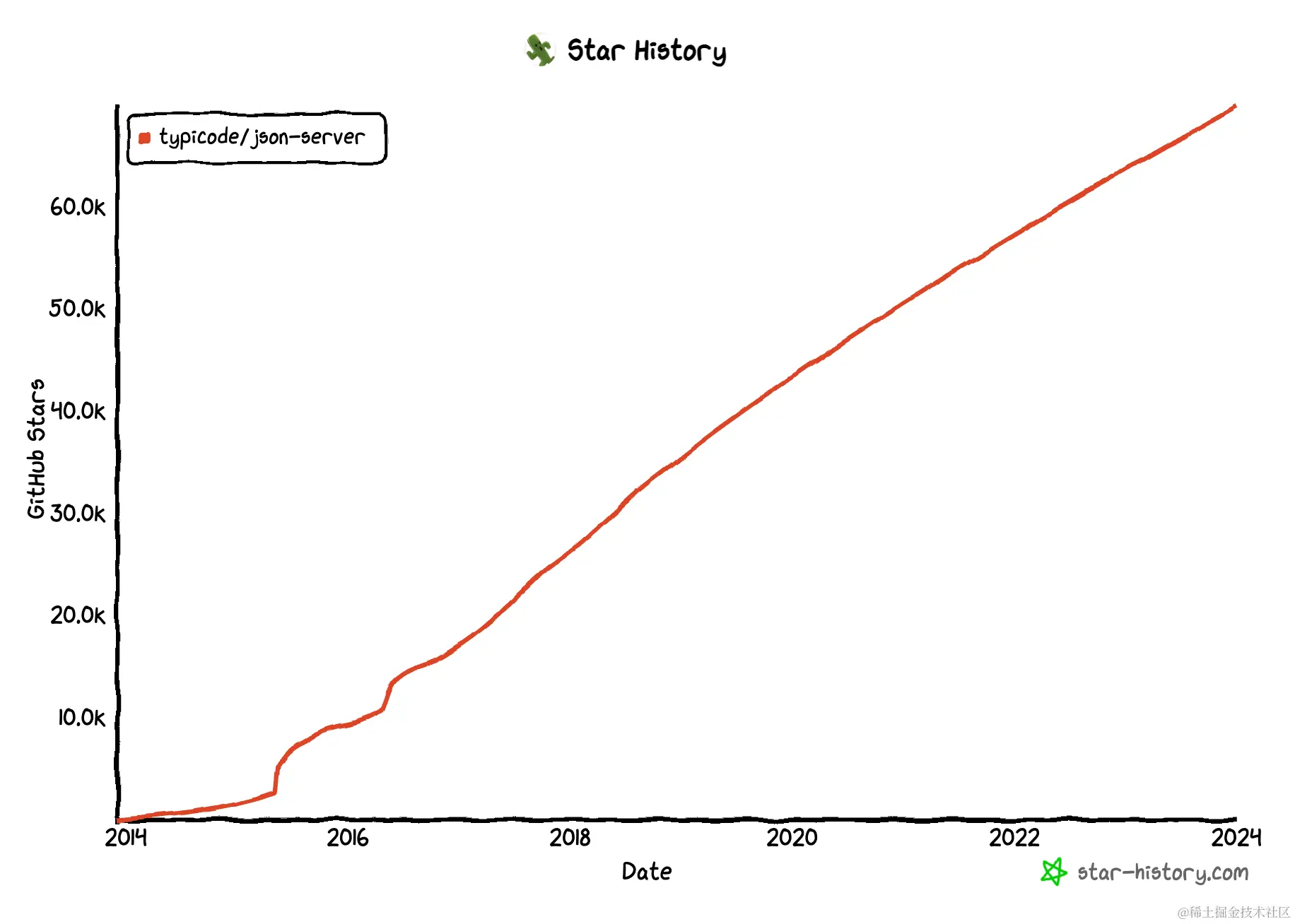 下面我截了一下json-server 的github star历史数据,很明显大家都对这个项目非常喜欢,上升趋势一直很强劲。