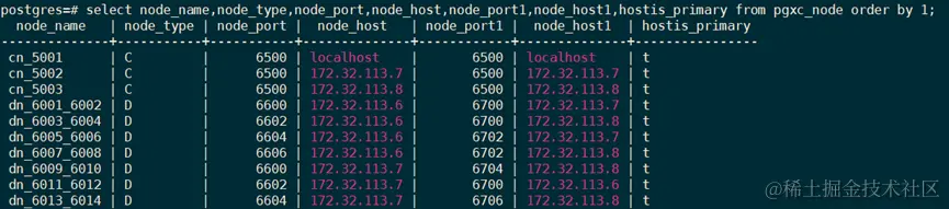下图pgxc_node系统表中,node_port,node_host为主机信息;node_port1,node_host1为备机信息。hostis_primary为主备关系,为t时,CN会先连接主机再连接备机,反之亦反。hostis_primary值由CM集群管理组件在主备切换时自动刷新。