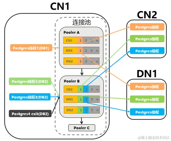 CN与DN建连立流程,和客户端与CN建连立流程基本相同。为了减少CN与DN建立连接,以及DN进程中postgres线程创建、销毁的开销,CN端实现了pooler连接池。