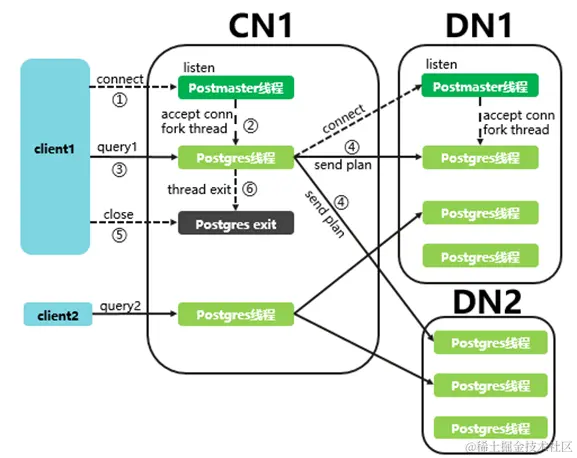 - CN postmaster主线程accept连接,创建postgres线程并将连接交给此线程处理;