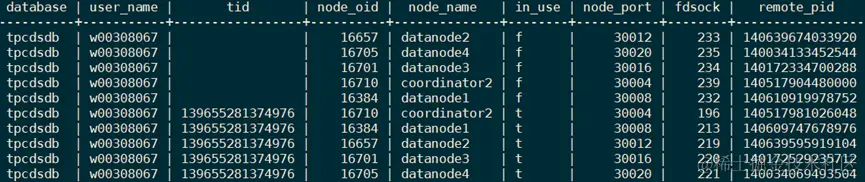 pg_pooler_status视图记录了pooler连接池中的所有连接信息。如下图所示,每一行表示本CN发起的一个连接,对应对端进程的一个postgres线程。in_use为‘t’表示这个连接正在某线程使用,为‘f’表示空闲连接等待复用。tid列为本CN的持有此连接的线程号node_name列为对端进程号,remote_pid列为对端线线程号。在query_id为0或CN/DN不一致时,通过pooler视图查找CN与DN连接关系。