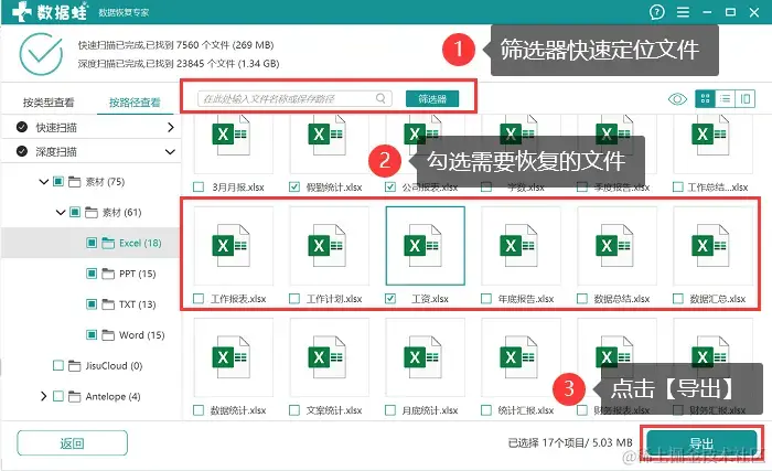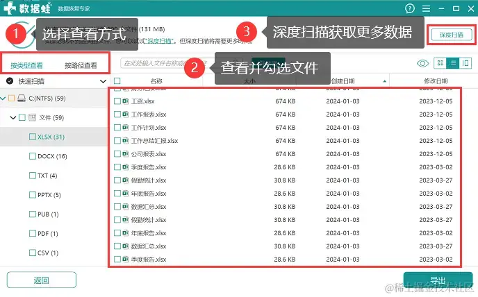 步骤4:深度扫描将对所选磁盘进行深入的扫描,用户应耐心等待,扫描完毕后,用户可对所有查找到的结果进行选择,由于文件或许被同名文件替换,在选择时,应核对所需恢复的文件的大小、时间等,勾选完成后,点击 【导出】。