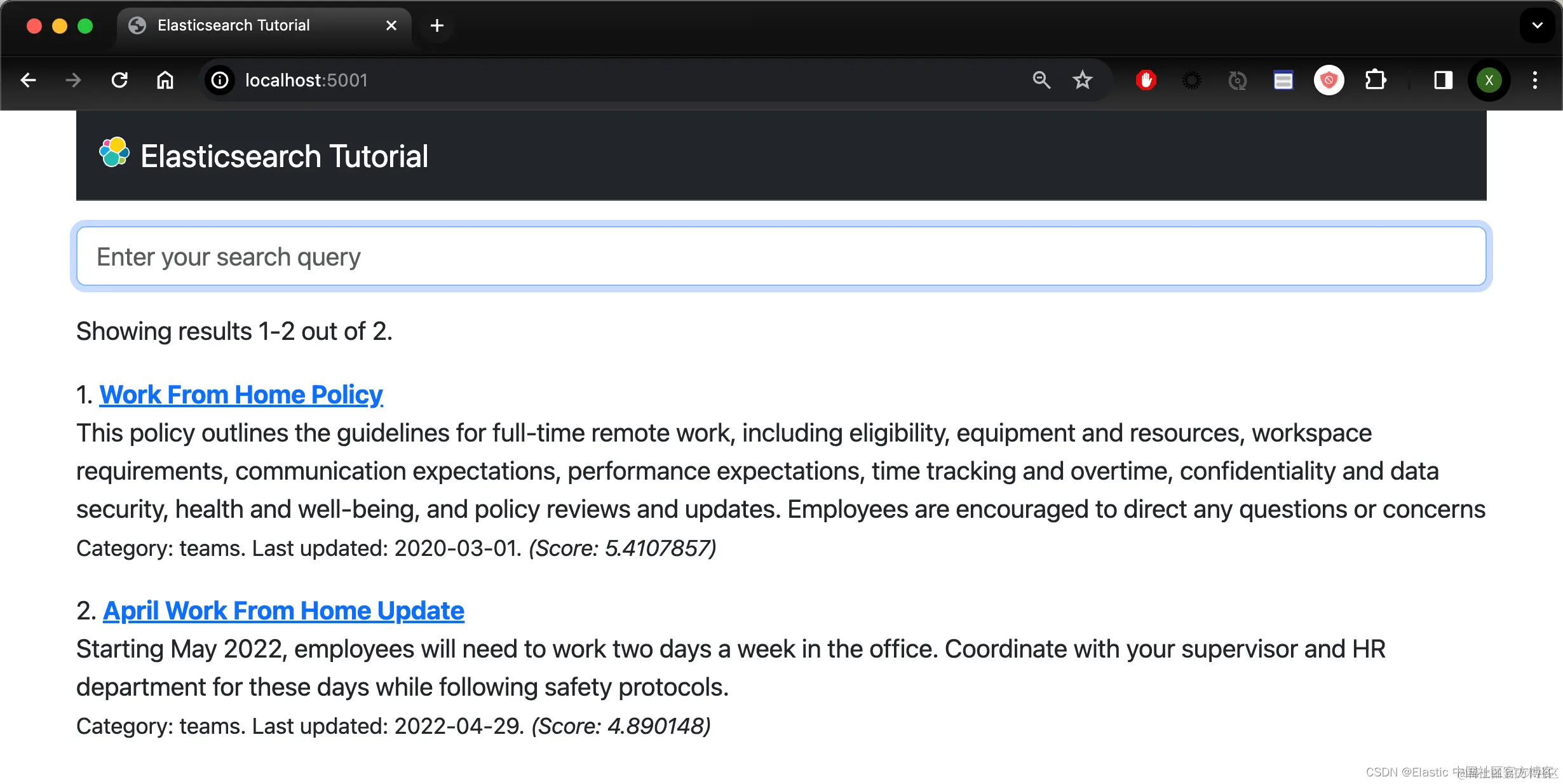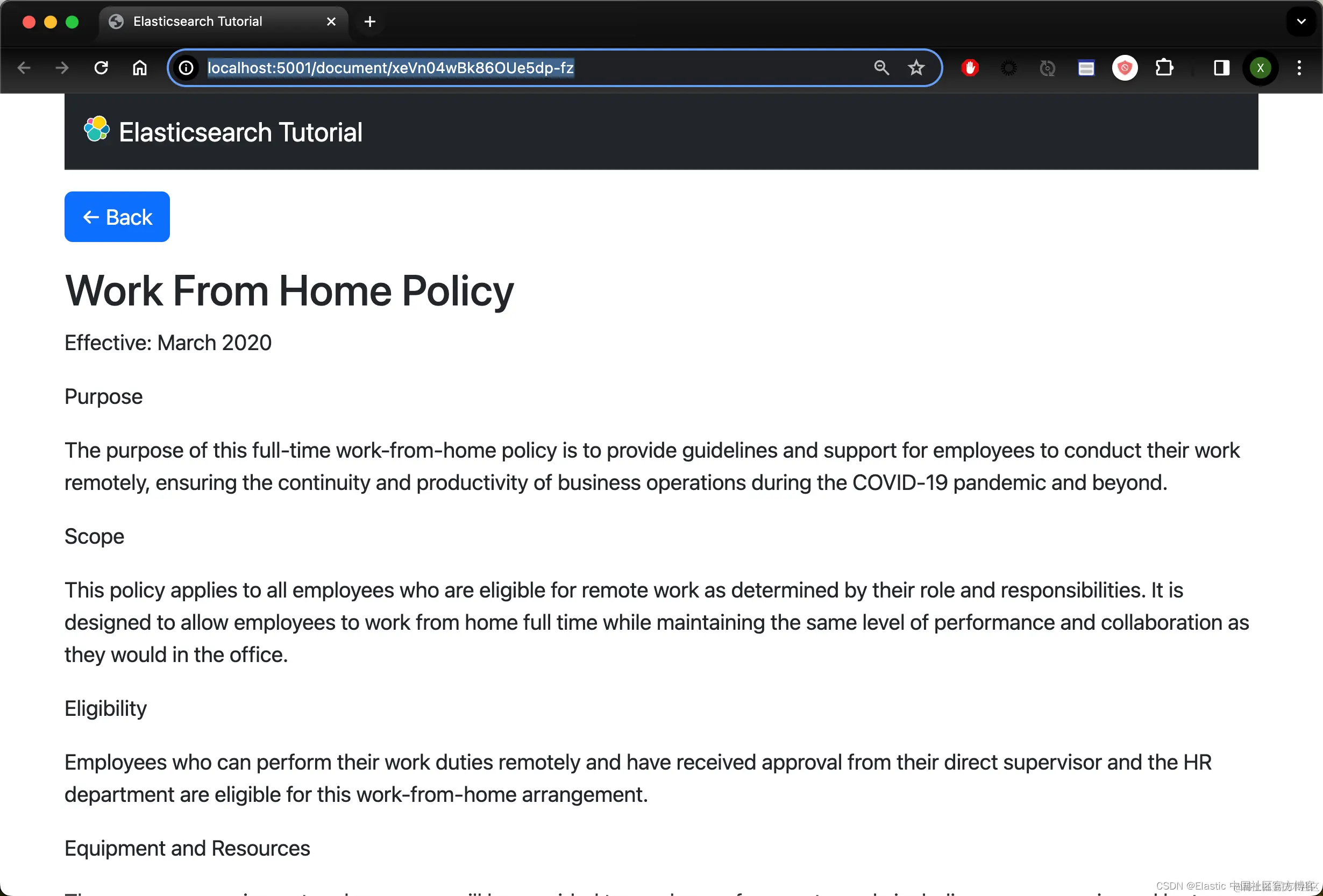 至此,该应用程序首次实现了全文搜索。 返回 Web 浏览器并导航至 http://localhost:5001 以打开应用程序。 如果由于任何原因你没有运行 Flask 应用程序,请在执行此操作之前重新启动该应用程序。 输入搜索文本(例如 polict 或 work from home),你将看到相关结果。 你可以在下面看到在家搜索工作时的结果: