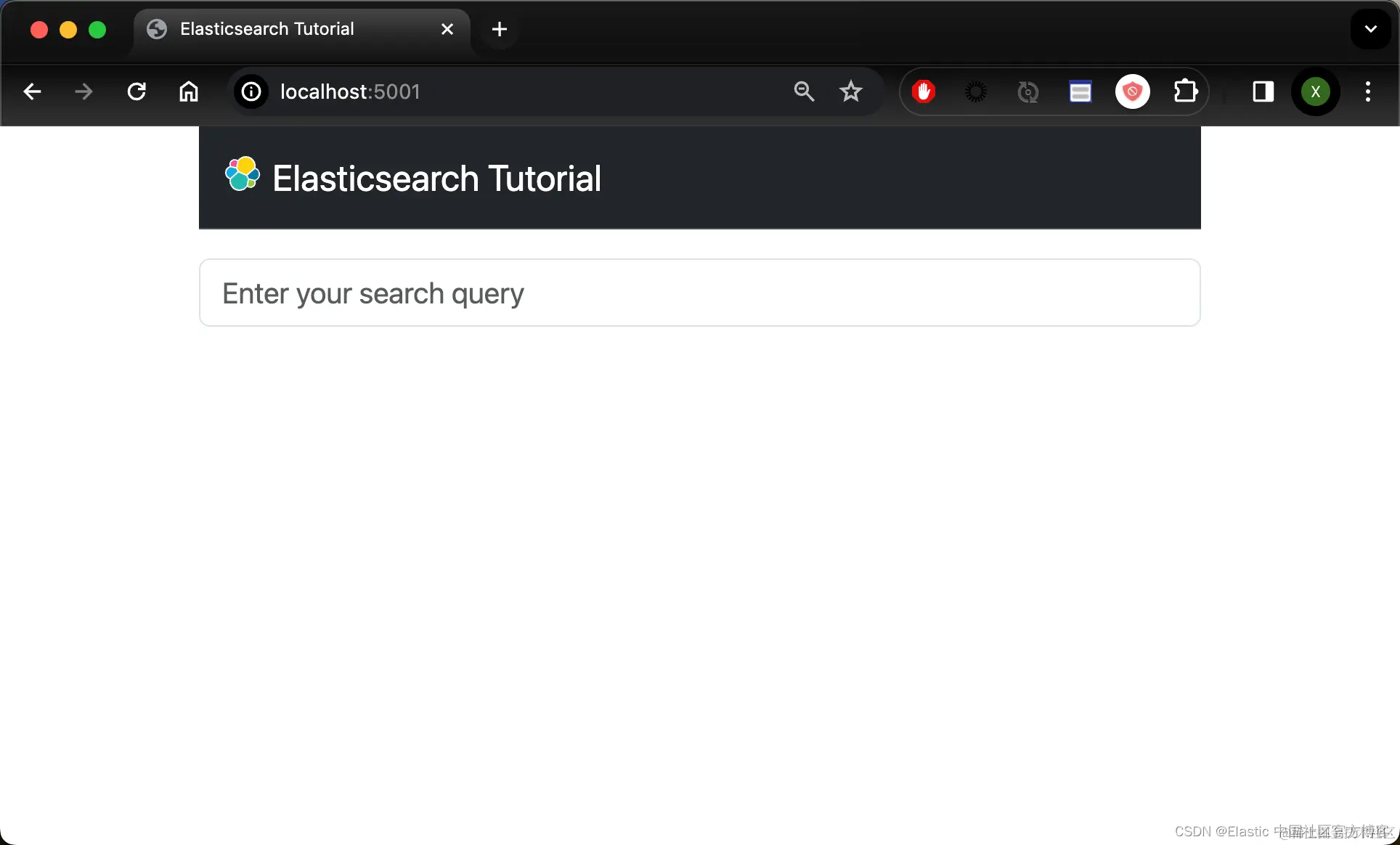 注意:早期阶段的应用程序只是一个空壳。 如果你愿意,你可以在搜索框中输入内容并请求搜索,但响应始终是没有结果。 在以下部分中,你将了解如何在 Elasticsearch 索引中加载一些内容并执行搜索。