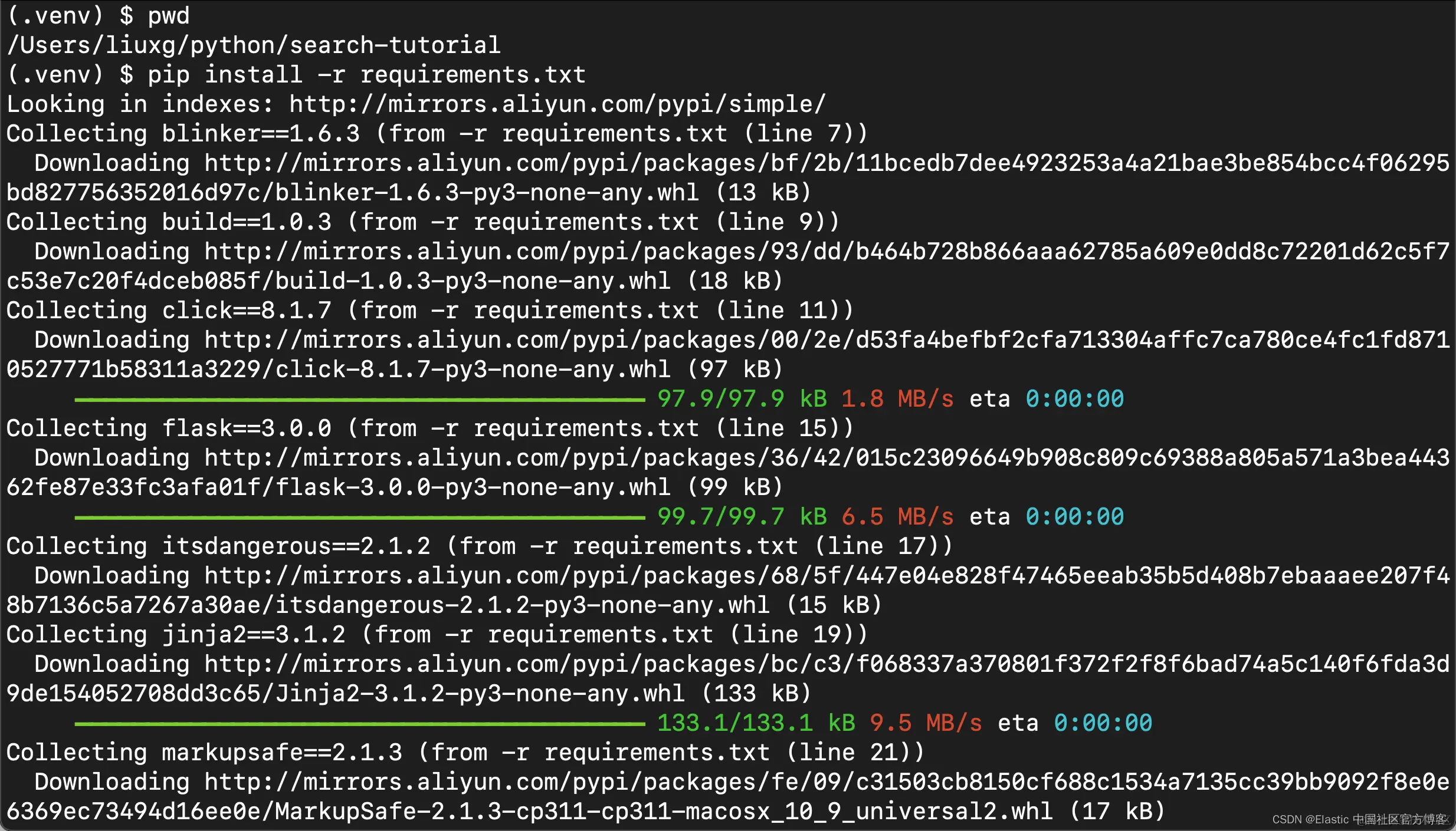 Elasticsearch 客户端库是一个与 pip 一起安装的 Python 包。 确保之前创建的虚拟环境已激活,然后运行以下命令安装客户端:
