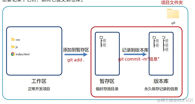作用: 将暂存区的文件进行版本记录;换言之:将暂存区文件提交到本地仓库: