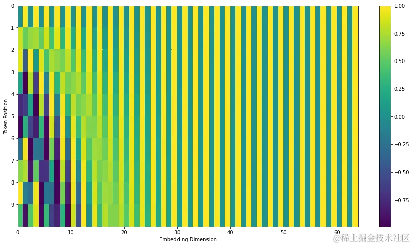2020 年 7 月更新: 上述的位置编码是基于 Transformer 的 Tensor2Tensor 实现。论文中展示的方法略有差异,它不是直接连接,而是将两种信号交织在一起。下图展示了这种编码的样子。点击此处获取生成该编码的代码: