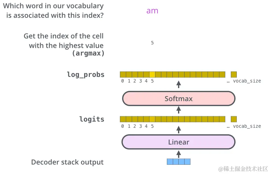 假设我们的模型掌握了从训练数据集中学习到的 10,000 个不同的英语单词(即模型的“输出词汇”)。这将使得 logits 向量的宽度达到 10,000 个单元,每个单元对应一个独特单词的得分。这就是我们如何理解经过线性层处理后模型的输出结果。