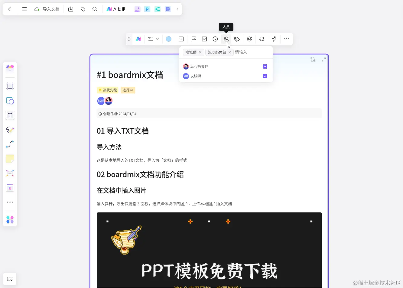 boardmix博思白板集成了强大的AIGC创作工具,在撰写文档的过程中,你可以使用「AI写作助手」来辅助创作,诸如文章续写、内容总结、错别字纠正等,提供实时建议以优化文本。