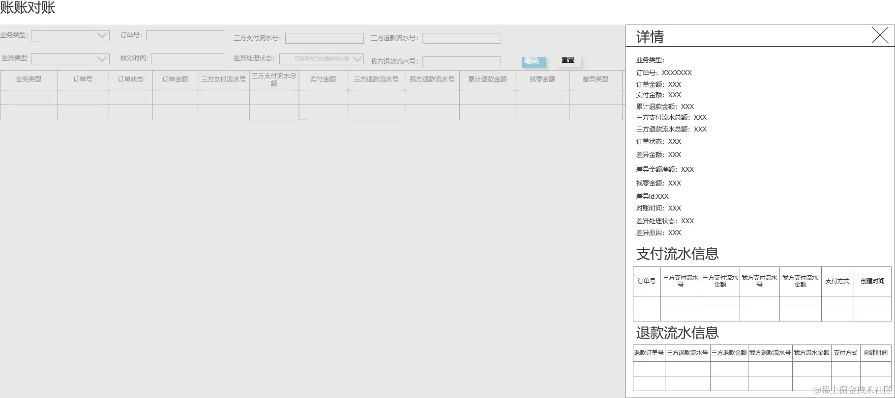 ① 基本信息详情展示: 包括业务类型/顶堤干号/订单金额/实付金额/累计退款/三方支付流水总额/三方退款流水总额/订单状态/差异金额/差异净额净额/找零金额/找零状态/差异id/对账时间/差异处理状态/差异原因。