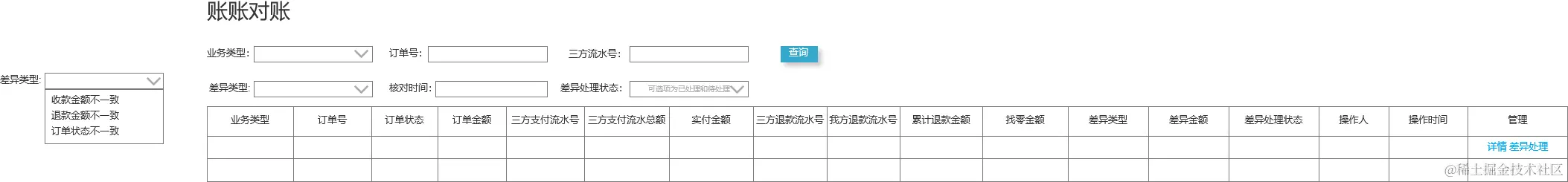 - 差异类型(原因):选项包括订单状态和金额不一致/三方流水大于我方流水/实付金额和售价不一致/我方流水大于三方流水/累计退款和退款流水不一致/未找零退款;