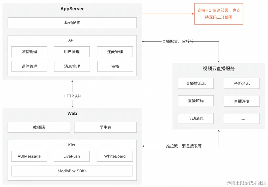 服务端AppServer:主要负责配置直播服务和管理课堂相关数据。开通阿里云云直播服务并配置好相关参数后即可访问阿里云直播中心,接入互动连麦、互动消息、直播链接鉴权等能力,并向客户端提供所需的HTTP接口。此外,我们还提供以源代码或镜像形式交付的工程,以及基于函数计算和容器镜像等的部署方式,大大提高搭建效率,方便客户更轻松地部署和运行服务端应用。