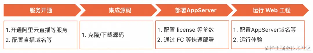 快速集成互动课堂主要分为服务开通、集成源码、部署AppServer、运行Web工程四大步骤。