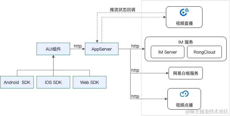 整体而言,该架构基于阿里云强大的云服务底层和丰富的音视频SDK确保音视频体验,降低开发者的音视频开发成本;通过提供丰富的业务组件、差异化的场景封装、全开源的前后端代码,让开发者按需集成,灵活定制,安全独立。
