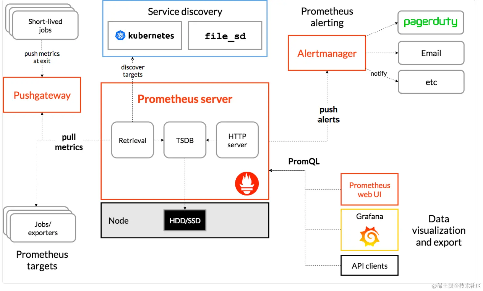 Prometheus Server :Prometheus Server是Prometheus的核心组件,主要负责从各个目标(target)中收集指标(metrics)数据,并对这些数据进行存储、聚合和查询。