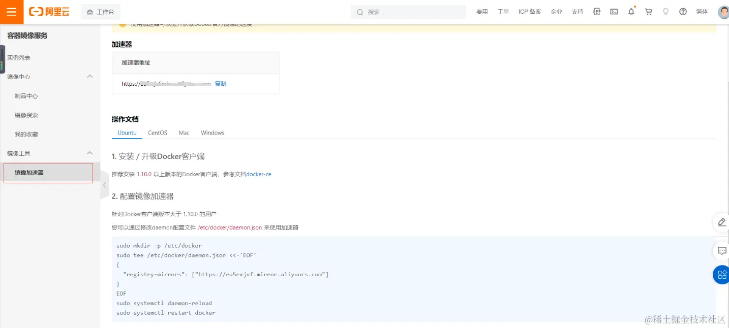 地址:cr.console.aliyun.com的控制台,使用支付宝账号登录,左侧加速器帮助页面会为你显示独立的加速地址,这个加速地址每个人的都不同。