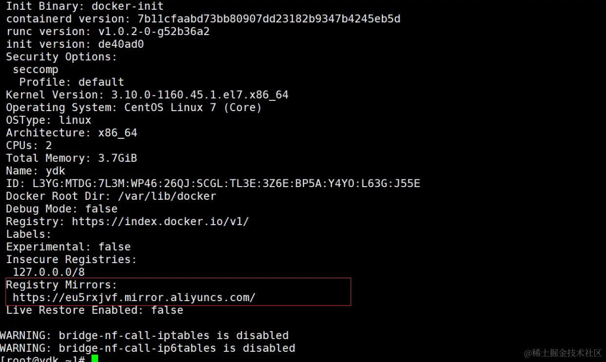 配置好了之后,我们使用之前学的命令,docker info查看一下是否新增了阿里云的地址。