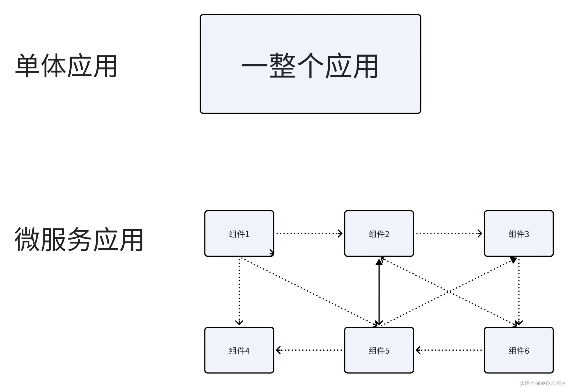 将整个应用程序作为一个单一的、可部署的单元构建。所有的功能模块都在同一个代码库和部署单元中。这种架构通常适用于小型应用或刚开始的项目。 -