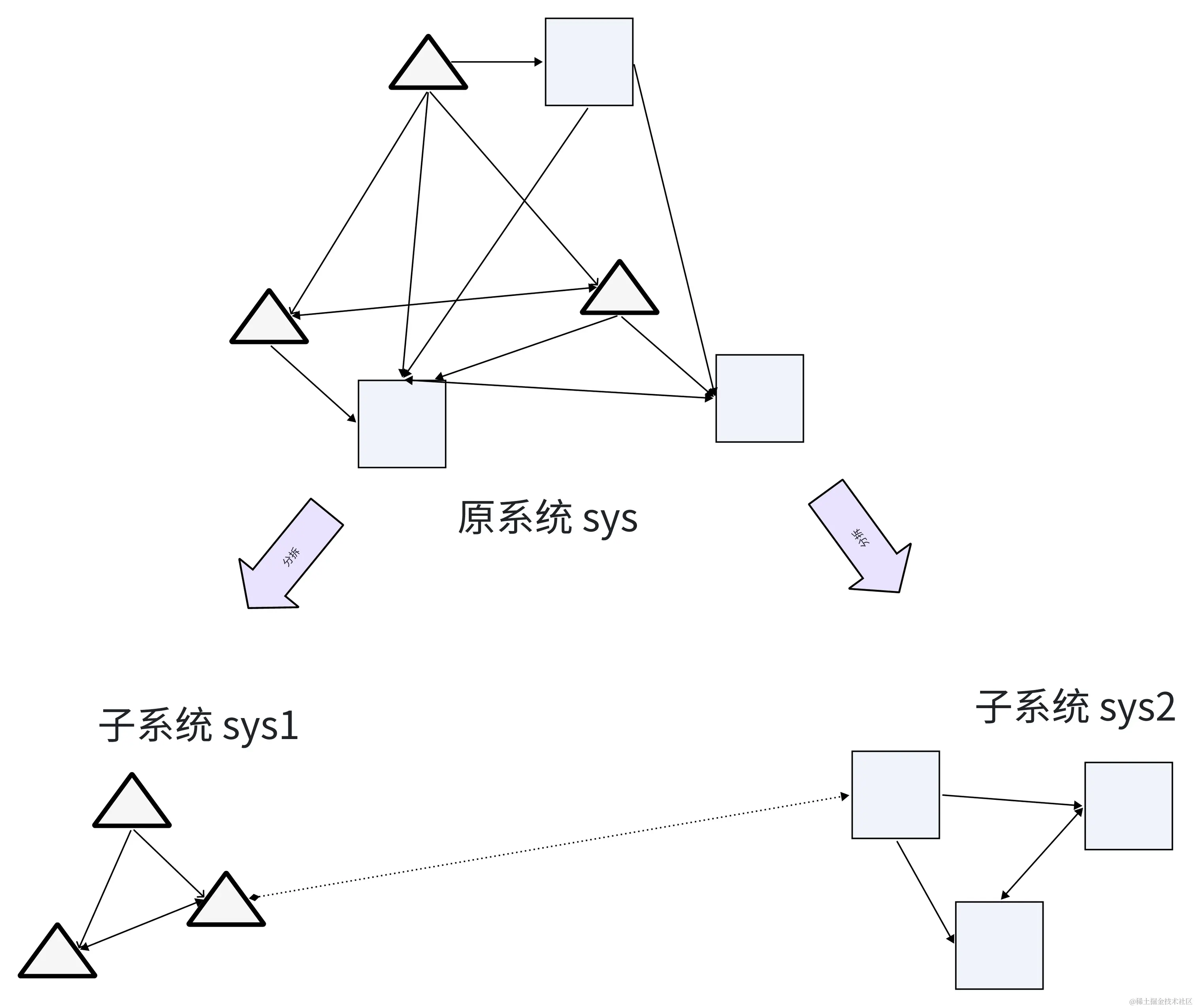 有一个系统 sys ,拆分后的两个子系统分别为 sys1 和 sys2 ,通过下图能看到,sys 的复杂度是远远大于 sys1 与 sys2 的复杂度之和。