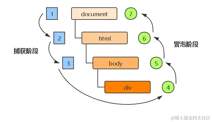 当我们给div注册一个点击事件时:即从上到下是捕获,从上到下是冒泡