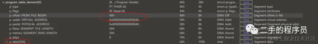 文件偏移与虚拟地址,它们都是40H,而且这个值与 elf_header 必须是相等的。这个值某种意义上就是 elf_header 的大小。那为啥还需要在这里再储存一次呢?
