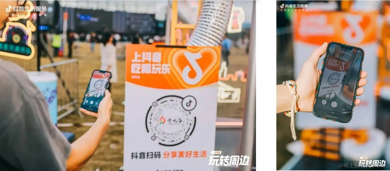除了打卡拍照和单车游戏,现场还放置了线下二维码物料,用户使用抖音进行扫码,即可一键带上指定话题tag和丹凤谷的地理定位,快速上传发布音乐节现场的精彩内容。