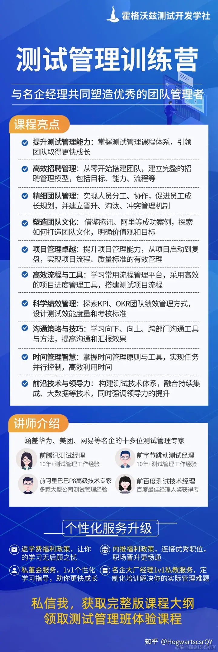 如果大家对于管理的这个话题还有一些其他的想要了解的一些内容的话,可以在我们群里去找我们的课程顾问了解一下霍格沃兹的这个测试开发的管理高级训练营,我们会从团队管理、流程管理、绩效管理等等这些涵盖到管理的方方面面的一些话题去给大家详细地去讲解。