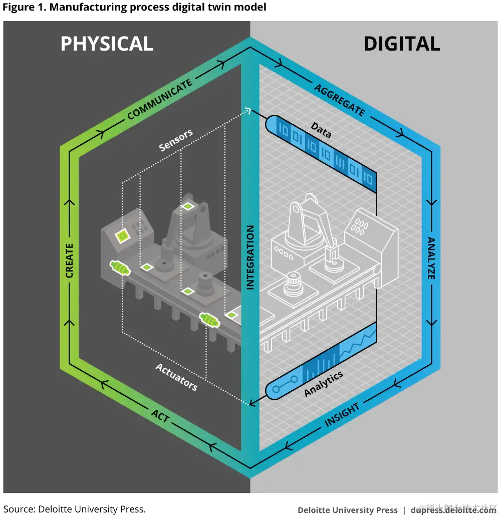 图 1 中的数字孪生配置代表了从物理世界到数字世界再到物理世界的旅程。这种物理-数字-物理的旅程或循环是德勤实现工业4.0方法的基石。工业 4.0 有时被称为“第四次工业革命”,它广义地描述了一种数字制造环境,它将先进的制造技术与物联网相结合,不仅创造了一个互联的制造企业,而且创造了一个通信、分析和使用信息以推动物理世界的进一步智能行动的企业。