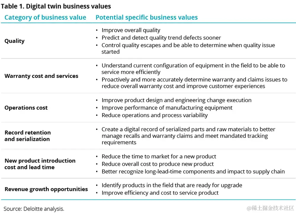 在考虑数字孪生提供的商业价值时,公司应关注与战略绩效和市场动态相关的问题,包括改进和更持久的产品性能、更快的设计周期、新收入来源的潜力以及更好的保修成本管理。除其他外,这些战略问题可以转化为特定的应用程序,这些应用程序可能会提供数字孪生可能实现的广泛业务价值。表 1 按类别列出了此类值的摘要。