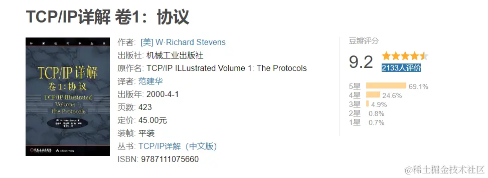 《TCP/IP详解卷1:协议》是一本完整而详细的TCP/IP协议指南。描述了属于每一层的各个协议以及它们如何在不同操作系统中运行。适合作为计算机专业学生学习网络的教材和教师参考书,也适用于研究网络的技术人员。